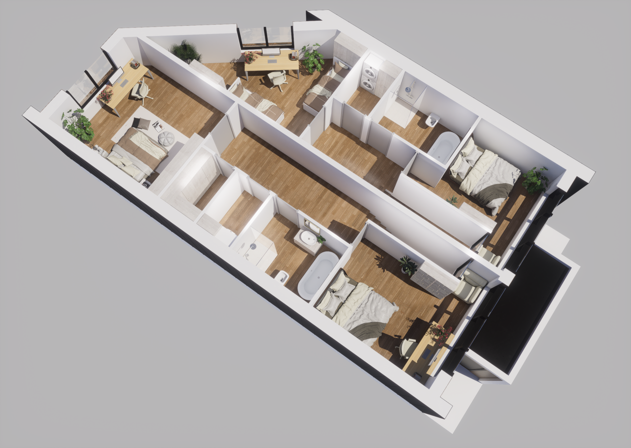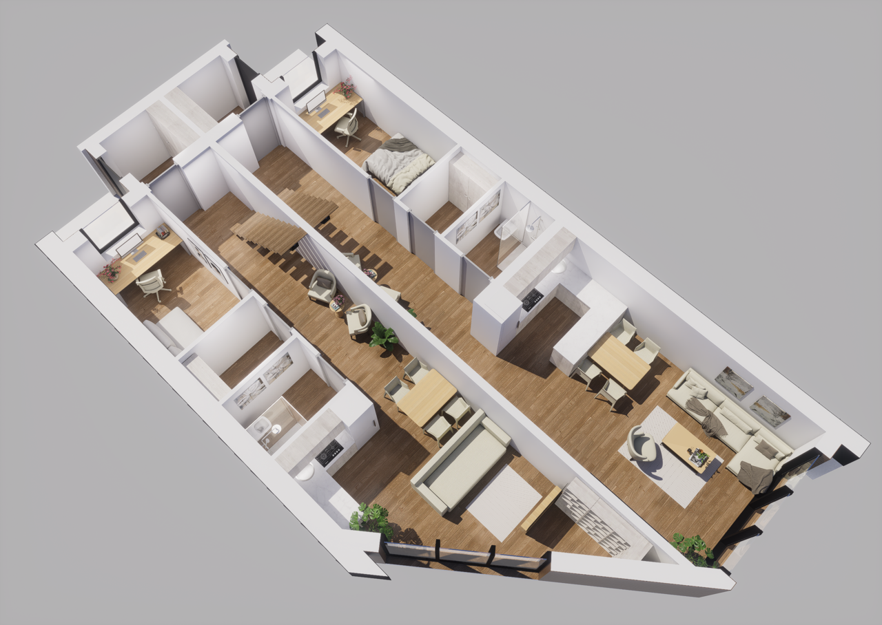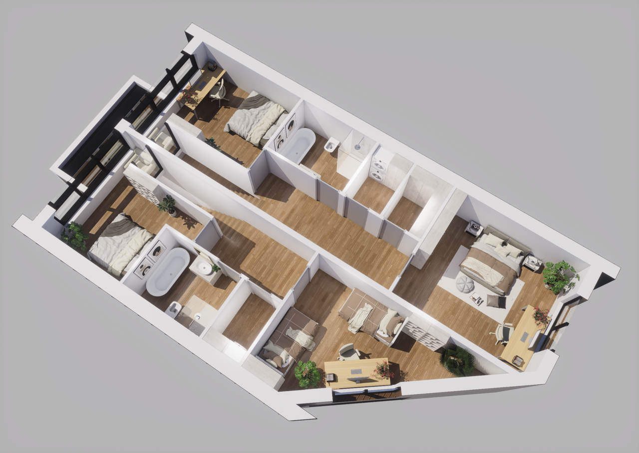 Każdy dom został zaprojektowany tak, aby maksymalnie wykorzystać przestrzeń i światło dzienne. Prosta, ponadczasowa bryła budynków oraz duże przeszklenia nadają inwestycji nowoczesny charakter. Wysoki standard wykonania i dbałość o detale przekładają się na komfort użytkowania przez lata.